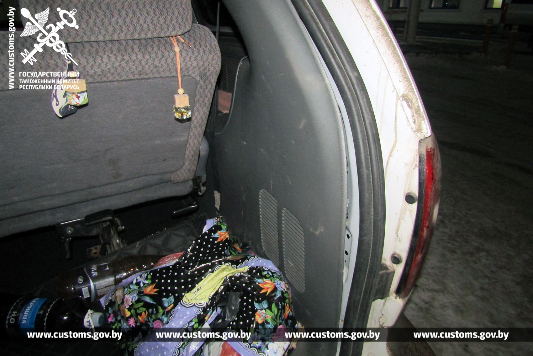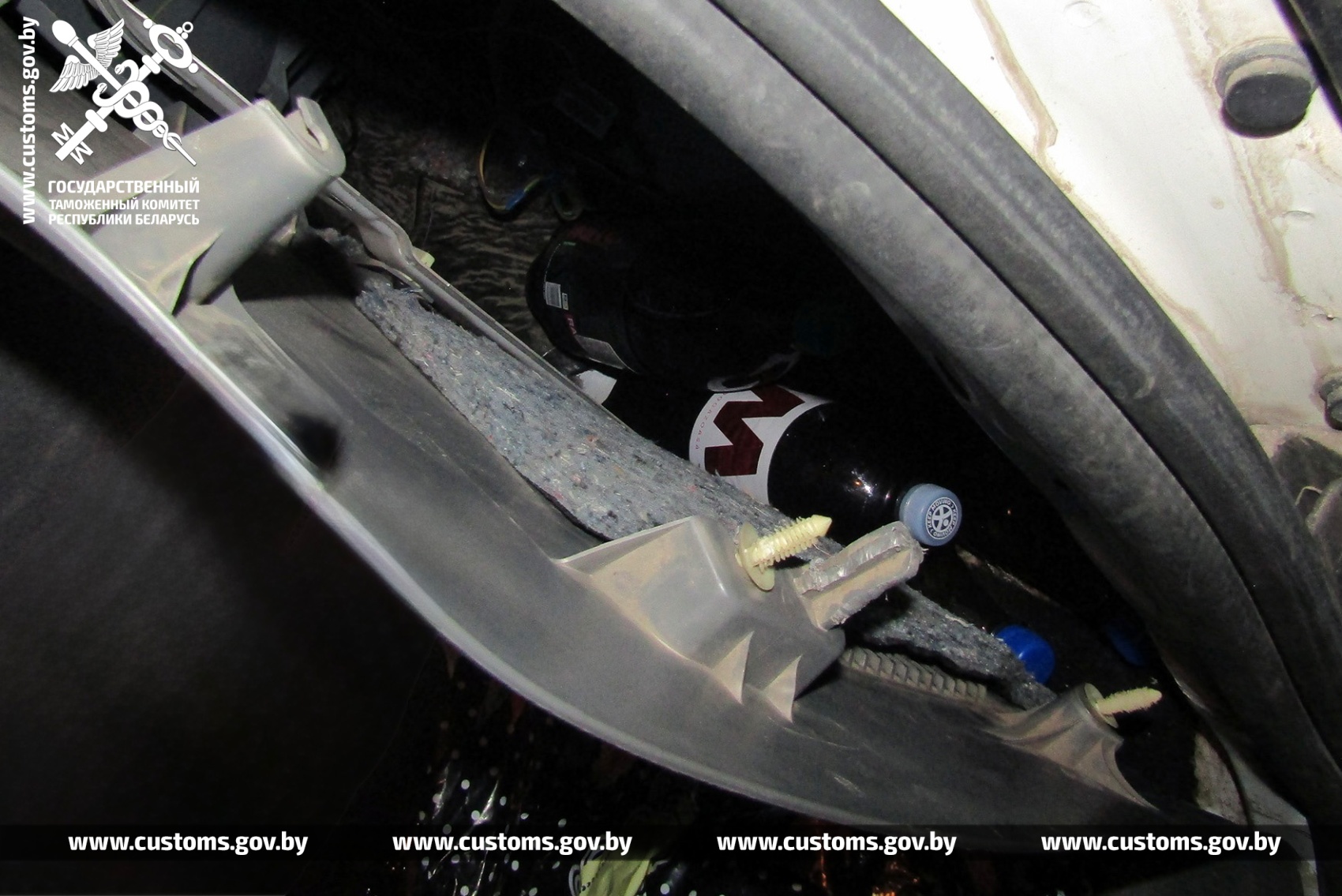 Агледзеўшы транспартны сродак з ужываннем сканавальнай тэхнікі, гродзенскія мытнікі прынялі рашэнне аб яго даглядзе. У выніку з багажнага аддзялення вынялі 8 бутэлек з вадкасцю, утоеных за пластыкавай ашалёўкай.